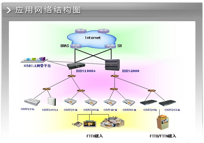 | GEPON宽带接入解决方案 | 可以实现FTTH(Fiber To The Home)光纤到户、FTTB(Fiber To The Building)光纤到建筑物、FTTC(Fiber To The Curb)光纤到园区等应用 |